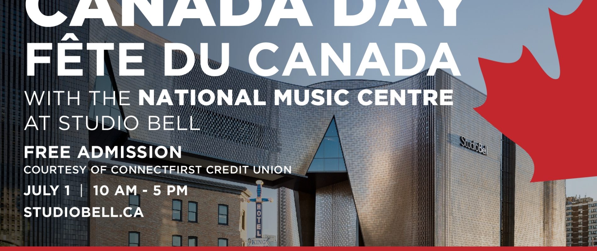 (Calgary, AB — June 1, 2023) On Canada Day (also the seventh anniversary of Studio Bell’s opening), Calgarians are invited to spend the day exploring the musical mosaic of the country. Admission to Studio Bell, home of the National Music Centre (NMC), will be free on July 1, courtesy of connectFirst Credit Union. Plus, NMC will be presenting live music on the King Eddy’s main floor and rooftop for a full-fledged building-wide bash.
